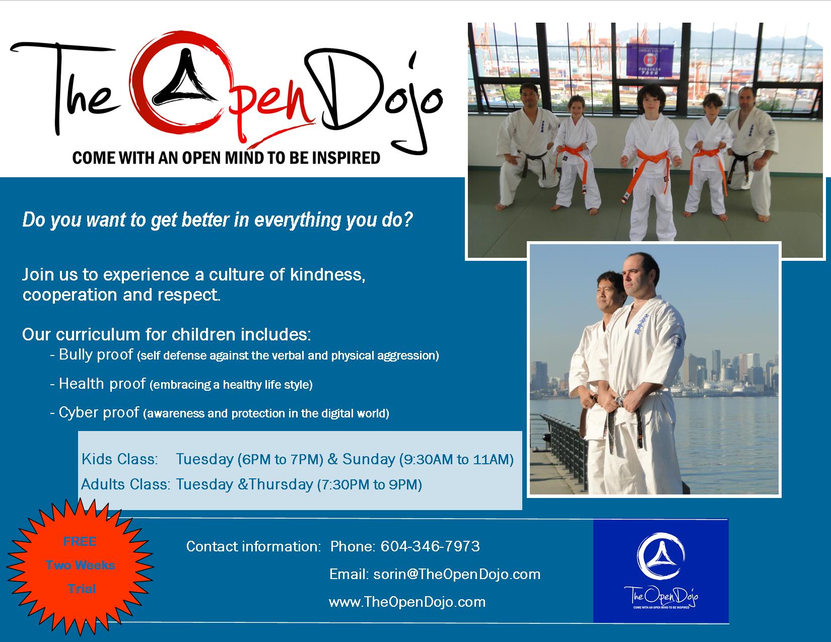 Here is our poster for classes starting in September. Mark your calendar with the following dates: Adults –> Thursday, September 5 Kids –> Sunday, September 8 See you in the dojo. OSU! Related